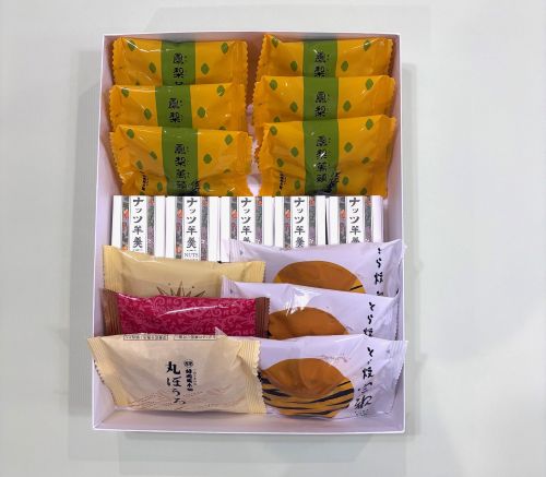 ■ナッツ小凾羊羹…5個 とら焼宗歓…3個 丸ぼうろ…1個 バターぼうろ…1個 チーズぼうろ…1個 鳳梨萬頭…6個
